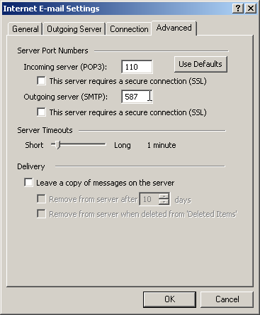 | On the 'Advanced' tab change the Outgoing server (SMTP) port to 587 and hit "OK". | |||
